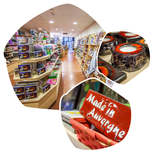 L’artisanat local est mis en avant et vous trouverez sans aucun problème un objet unique à ramener chez vous ou à offrir parmi les bijoux, les objets en lave émaillée (dessous de plats, cadres décoratifs, glaçons en pierre de Volvic…), des savons… Vous pourrez également découvrir une multitude de livres pour enfants ou adultes sur la région ou bien encore la faune et la flore. Et pour les plus gourmands, rendez-vous au rayon spécialités locales !